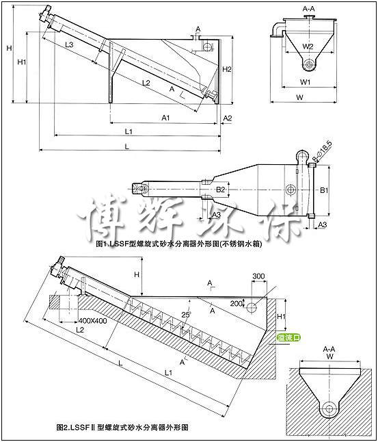 (1)螺旋式砂水分離器由無軸螺旋、襯條、U 型槽、水箱、導流板、出水堰和驅動裝置組成。