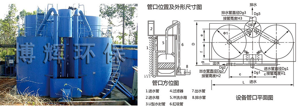 無(wú)閥過(guò)濾器剛投入運(yùn)行時(shí),濾料層較清潔,虹吸上升管內(nèi)外的水面差標(biāo)志著濾池初期水頭損失,一般約為20cm。隨著過(guò)濾的進(jìn)行,濾層中雜質(zhì)漸增多,其阻力也就慢慢變大,但因進(jìn)水流量不變,所以進(jìn)水管和虹吸上升管中的水位便自動(dòng)地慢慢上升。