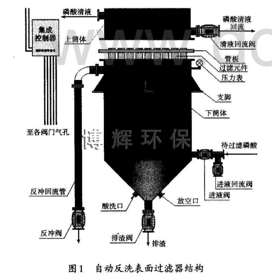 自動反洗表面過濾器是利用自身過濾的清液來完成反沖洗過程,反沖洗時不需要排空過濾器,反沖洗過程可在數秒內完成,反沖洗結束后過濾器又可進行過濾,反沖洗下來的濾渣由排渣口排出,整個過程由電腦自動控制。